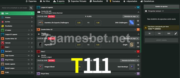 O T111 oferece uma grande seleção de opções de apostas em e-sports com probabilidades competitivas